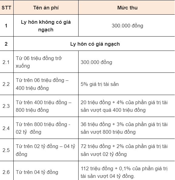 Lưu ý: Nếu yêu cầu ly hôn được giải quyết theo thủ tục rút gọn thì vợ chồng phải chịu mức án phí bằng 50% mức án phí nêu trên.